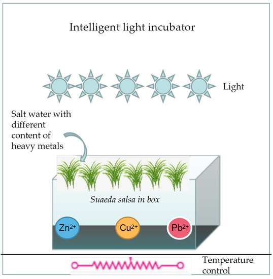 (2) Prepare 1 L of Hoagland’s nutrient solution × 5 bottles, add copper, zinc and lead ions of different concentrations to the nutrient solution, add sea salt to the nutrient solution to simulate seawater and adjust the salinity to 10 ‰, then change the soil culture of Suaeda salsa to water culture;