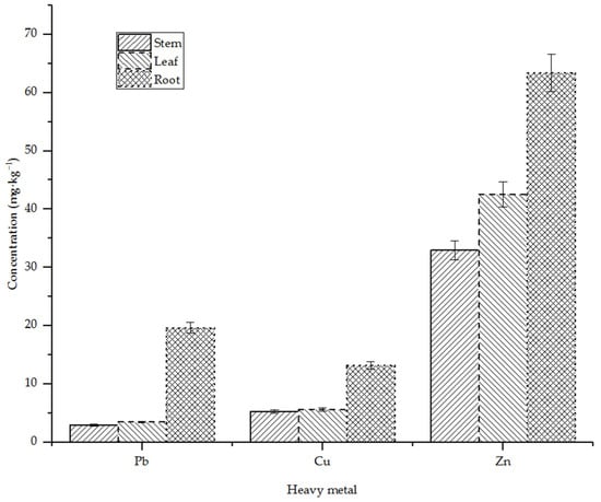 Because the mature plants of Suaeda salsa are large, the concentration of heavy metals in different parts of Suaeda salsa in salt land can also be reflected by measuring the root, stem and leaf respectively. It can be seen from the Figure 3 that the three heavy metals were enriched in Suaeda salsa, with more zinc and less copper and lead. The enrichment of plant roots was greater than that of stems and leaves, which is similar to the previous research results [12]. This was consistent with the content of different heavy metals in the sediment. According to the data analysis, the average absorption of heavy metals Cu, Pb and Zn by Suaeda salsa was 8.01 mg·kg−1, 8.67 mg·kg−1 and 46.30 mg·kg−1, respectively.