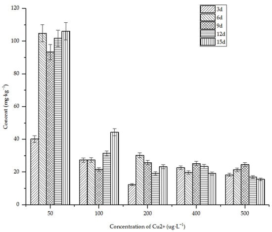 The changes of copper ions in Suaeda salsa are shown in Figure 5. It can be seen from Figure 5 that, at low concentrations, Suaeda salsa had good enrichment with heavy metal copper, with the highest content being 106 mg·kg−1. However, in the high-concentration solution, the copper content in Suaeda salsa was lower, perhaps because high concentrations of copper inhibit the growth of Suaeda salsa. With the extension of time, the content of copper in Suaeda salsa in salt land basically remained unchanged under various concentrations.