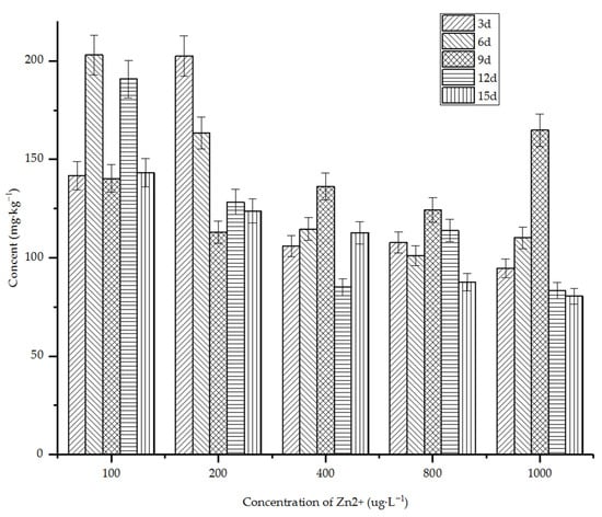 As shown in the Figure 6, Suaeda salsa can absorb zinc, and the absorption amount was higher at each concentration than copper. In the low-concentration range, Suaeda salsa had a higher absorption of zinc. With the increase in the initial concentration, the reduction of zinc decreased. At the concentration of 50 and 100 ug·L−1, the absorption of heavy metal zinc by Suaeda salsa was more than 200 mg·kg−1 on the third day. When the concentration of heavy metals increased, the absorption decreased. It could have been caused by the dilution effect of plant growth and the inhibition of normal absorption, metabolism and other biochemical processes of plants at high concentrations of heavy metals [13]. With the extension of culture time, the content of heavy metal zinc in Suaeda salsa in salt land increased at first, then decreased slightly and then remained basically unchanged.