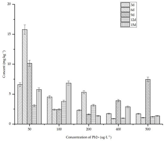 The absorption trend of lead by Suaeda salsa in salt land was similar to that of copper, as shown in Figure 7. However, the overall absorption was low, and the maximum absorption in the body was not more than 20 mg/kg. The absorption of Suaeda salsa in a low concentration was greater than that in a high concentration. At the same concentration, the lead content in Suaeda salsa increased first and then decreased later. In addition to the dilution effect of plant growth, the content of lead ions in Suaeda salsa decreased gradually with the extension of culture time. It was speculated that the Suaeda salsa might have an excretion mechanism for lead ions.