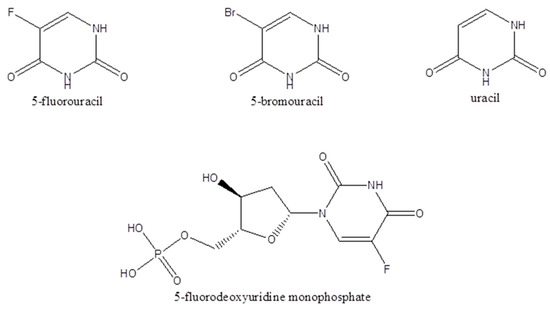 The chemical structures of 5-fluorouracil, 5-bromouracil, uracil, and 5-fluorodeoxyuridine monophosphate.