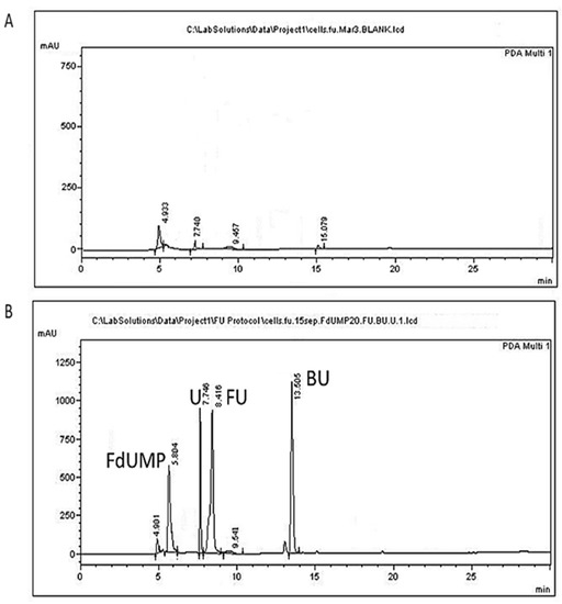 Peaks originating from HPLC analysis for 5-FU and uracil were identified by retention time and spectrum analysis. Unidentified peaks were subjected to ESI-MS analysis on an LC-20AD Shimadzu connected to Shimadzu LCMS-2010EV equipped with a C18 analytical column (Reprospher 100 C18-DE, 5 µm 250 × 4.6 mm, Dr Maisch GmbH, Ammerbuch, Germany) using 1% formic acid in 50:50 v/v acetonitrile: water. The obtained mass spectra of these compounds were compared to the standard spectra of the NIST Mass Spectral Library (NIST Chemistry WebBook, SRD 69, National Institute of Standards and Technology NIST 100 Bureau Drive, Gaithersburg, MD, USA) for 5-FU and uracil, while for 5FdUMP, the mass spectra were compared to the spectra of the pure standard and to the standard spectra of the Human Metabolome Database (HMDB).