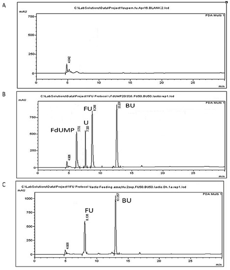 Representative chromatograms of L. lactis cell-free culture supernatants. (A) A blank sample; (B) a BSM sample spiked with 50 μg/mL of 5-FU (FU), 10 μg/mL uracil (U), 30 μg/mL FdUMP (FdUMP), and 50 μg/mL of the internal standard 5-BU (BU); (C) culture supernatant collected at 0 h following administration of 50 μg/mL 5-FU at 0 h.