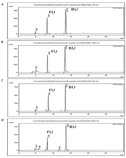 The reduction in 5-FU levels observed when incubations were performed in the dark amounted to the negligible amount of 0.2% (Figure 4A,B), indicating that abiotic factors other than light do not result in the degradation of 5-FU. However, a reduction of 36.2% was observed following incubation under normal light for 96 h in combination with the occurrence of a peak with a retention time of 6.9 min. Similar reduction and two extra peaks were observed when 5-FU was incubated under UVB light [54], and the peaks were identified as photoproducts formed following the addition of water to one double bond of the molecule. Since the parent compound was reported to present improved toxicity against cancer cells compared to the products of transformation by light, care was taken to avoid photodecomposition of the drug in the present study, and all experiments were conducted in the dark.
