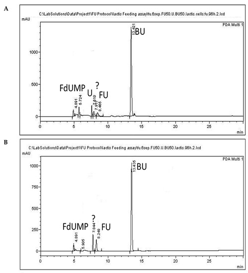 Moreover, our results presented in Table 3 suggest that only a small portion of 5-FU is transformed to its active metabolite, while the other part may be excreted or may lead to the formation of other products. The resistance of certain bacteria to 5-FU has been attributed to mutations in the uracil phosphotransferase (upp) or to the protein/uracil phosphoribosyl transferase (pyrR) genes, either by inhibiting the formation of FdUMP or by de novo production of UMP [19]. Although strain-specific differences occur, the activity of upp has been documented in L. lactis MG1363 [55]. However, both upp and pyrR mutations lead to decreased uracil metabolism [56]. Uracil concentrations in cells at 96 h following 5-FU administration amounted to 0.94 μg/mL and presented a distinct increase compared to control cells in which free uracil levels were below LOQ, indicating a decreased metabolism of uracil. These increased uracil levels agree with accumulating uracil due to its decreased metabolism. All peaks showed increased similarities in absorbance data comparisons (Figure S1A–C). The extra peak appearing at 7.8 min in culture supernatant, and at 7.9 min in the cells and the culture supernatant indicated by a question mark in Figure 5, showed a similarity of only 75% in the UV spectrum to commercial uracil or to commercial 5-FU (Figure S1D,E). This led us to further examinations of this peak using ESI-MS analysis, which revealed that it does not correspond either to uracil or to 5-FU, but that it presents close resemblance to the inactive metabolite 5,6-dihydro-5-fluorouracil (FUH2) (Figure S1F). Although this metabolite was not quantified in the present study, its presence indicates that a considerable part of 5-FU is transformed into this inactive metabolite. This finding agrees with previous reports of inactivation of the majority of the administered 5-FU as FUH2 [57]. A low 5-FU degradation rate in patients with metastatic colon cancer was correlated with an increased efficacy of the drug and improved chances of survival [58]. Further research on other bacterial strains and their combinations is needed to determine the levels of 5-FU that are inactivated through metabolism by the probiotic bacteria coadministered with the drug, possibly leading to a decreased efficacy of treatment.