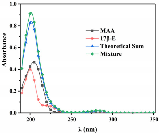 Ultraviolet absorption spectra of E2, MAA, and mixture of E2 and MAA in acetonitrile solution.