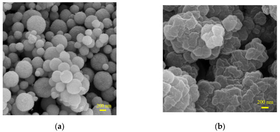 The SEM images of Fe3O4 particles and MMIPs are presented in Figure 2a,b. Fe3O4 particles were regular spheres with a diameter of about 70–300 nm. Because of the small diameter, Fe3O4 could be easily assembled by polymerization. The SEM images of MMIPs displayed the polymer coating on the surface of Fe3O4, which would provide higher specific surface areas and enhance the sorption capacity of MMIPs.
