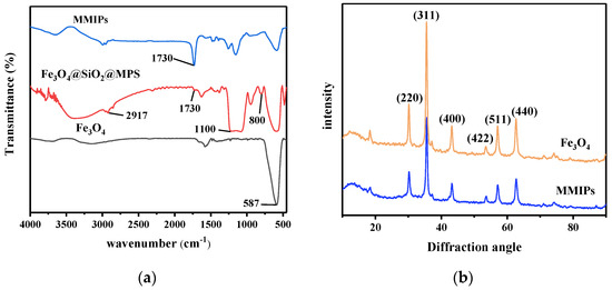 (a) FTIR spectra of Fe3O4, Fe3O4@SiO2@MPS, and MMIPs; (b) XRD patterns of Fe3O4 and MMIPs.