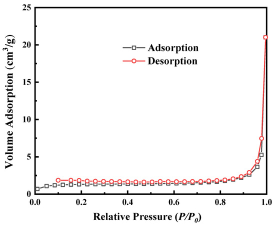 The crystal phases of Fe3O4 and MMIPs were analyzed by XRD in Figure 3b. In the 2θ region of 10–90°, the six diffraction peaks appeared in both Fe3O4 and MMIPs at angles 30.02°, 35.48°, 43.28°, 53.55°, 57.05°, and 62.68°, which match with the crystallographic plane of Fe3O4 (220, 311, 400, 422, 511, and 440) according to JCPDS (JCPDS No. 19-629). The presence of diffraction peaks in the XRD patterns indicated that the phase component was not changed during the preparation process. The nitrogen adsorption–desorption isotherm of MMIPs, a typical IV isotherm with an H3 hysteresis loop, is displayed in Figure 4. The BET-specific surface area and total pore volume of MMIPs were 4.1618 m2/g and 0.032025 cm3/g, respectively.