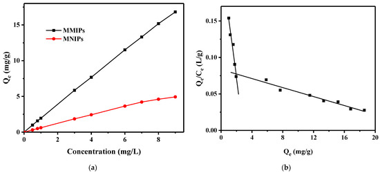 The saturated binding concentration of MMIPs and the types of MMIPs binding sites were studied by the Scatchard model [37]. The relationship between Qe/Ce and Qe based on the Scatchard model is shown in Figure 6b. The fitting curves showed two different linear relationships in different ranges, indicating there were high-affinity and low-affinity adsorption sites on MMIPs. The Scatchard parameters of the fitting curves were shown in Table S3.