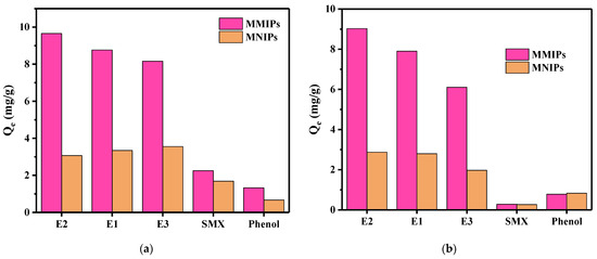 Adsorption capacity of MMIPs and MNIPs for E2 and other four compounds in: (a) single system, and (b) multiple system. Conditions: [E2 or other compounds]0 = 5 mg/L, [MMIPs or MNIPs]0 = 0.5 g/L, T = 30 °C, and pH = 6.0.