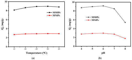 The effects of temperatures between 15 °C and 35 °C on the adsorption process were evaluated and the results are shown in Figure 8a. When the temperature increased from 15 °C to 30 °C, the adsorption amounts of MMIPs were improved and, subsequently, the increase in temperature had little effect on the adsorption capacity. Therefore, the mass transfer rate between adsorbent and pollutants is positively correlated with temperature, and with the increase in adsorption temperature, the adsorption rate also increases.