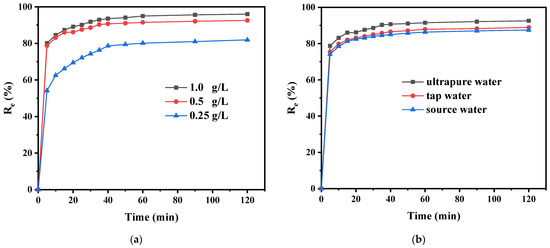 The effect of the MMIP’s dosage on the removal efficiency for E2 was investigated at three levels (0.25, 0.5, and 1.0 g/L). As displayed in Figure 9a, the removal of E2 improved with the enhancement of MMIPs dosage. Compared with the adsorbent dosage of 0.5 g/L, the removal of E2 was not significantly improved at 1.0 g/L of MMIPs, indicating that the adsorption sites in the reaction solution reached saturation. The influence of the substrates in the actual water for E2 removal efficiency was investigated based on the adsorption performance of MMIPs in tap water and source water, as displayed in Figure 9b. Compared with ultrapure water, the removal efficiency of E2 in tap water and source water decreased slightly but the reduction was not obvious, indicating that MMIPs could preferentially adsorb E2 in the presence of exogenous ions and natural organic matter.