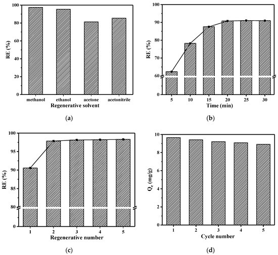 The regeneration and reuse of adsorbent were also important indexes to evaluate its performance. In the experiment, the four regenerative solvents, methanol, ethanol, acetone, and acetonitrile, were used to investigate the regeneration of adsorption-saturated MMIPs and the effects of regenerative time and frequencies on regeneration efficiency were also investigated. As shown in Figure 10a, the best regenerative solvent for MMIPs was methanol, so methanol would be used for regeneration when MMIPs reached adsorption saturation.