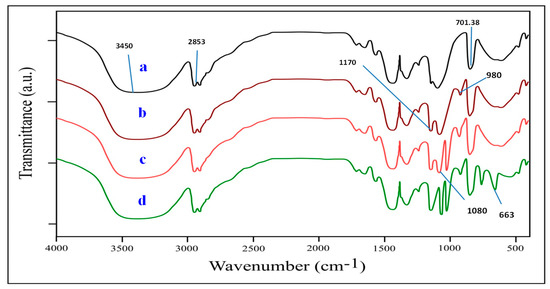 Several function groups in the synthesized PPVP composite were advanced using key observations from Fourier transformation infrared spectroscopy (FT-IR). The main assignments in the synthesized PPVP were measured as 2853 cm−1 (-CH aliphatic), 701.38 cm−1 ((CH2)n aliphatic), 1170 cm−1 (-P=O), 819.83 cm−1 (-P-N), 980 cm−1 (-P-OH), 1080 cm−1 (-C-N), 1090 cm−1 (-C-O) and 3450 cm−1 (-OH). After the condensation of PVA with conc. phosphoric acid to form PPVA, new assignments appear at 1170 cm−1 (-P=O) and 980 cm−1 (-P-OH). Moreover, the condensation between PPVA and bis-(2-ethylhexyl) amine constructs other new assignments such as 819.83 cm−1 (-P-N) and 1080 cm−1 (-C-N). It was established that only -P=O assignment at 1170 cm−1 was shifted to a lower wave number (1160 cm−1) after condensing with the amino group of bis-(2-ethylhexyl) amine. It is assumed that the principle vibrational assignments were observed at 3450 cm−1 of the -OH group of PPVP, which should disappear after condensation, but it just did not happen, as the partial phosphorylation of PVA leaves a fair number of hydroxyl groups without phosphorylation. The other assignments of PPVP that remained unchanged after condensation were 701.38 cm−1 ((CH2)n aliphatic), 2853 cm−1 (-CH aliphatic), 1090 cm−1 (-C-O) and 3450 cm−1 (-OH). The FT-IR spectra of the PPVP with zirconium ions are shown in Figure 1, which reveal the shift to a lower frequency of two characteristic assignments of –P=O from 1160 to 1140 cm−1, with a wave number difference of ≈ 20 cm−1, and –P-OH from 980 to 950 cm−1, with a wave number difference of ≈ 30 cm−1. The advent of a new band in the chelate at 772.02 and 663.02 cm−1 may be considered for the formation of coordinated Zr–O bonds [89].