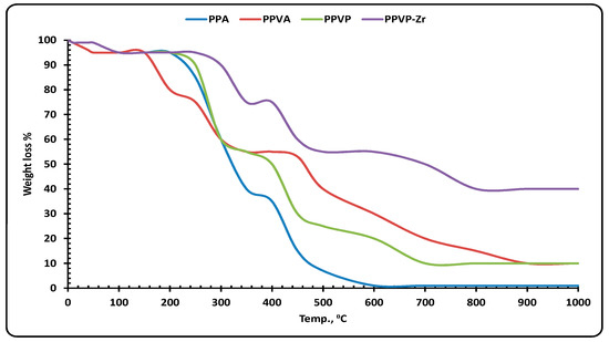 The TGA data show that, at 105 °C, PVA, PPVA, PPVP and PPVP-Zr samples all lost weight, up to about 5%. The evaporation of the adsorbed water causes this loss. At 105 °C, PVA separated itself visibly from the other samples. Unaltered PVA showed three inflexions, one at 105–250 °C (10% weight loss), one at 250–450 °C (70% weight loss) and one at 450–600 °C (15% weight loss), matching these three decomposition phases. The first temp. was associated with the side chain polyene and cyclization reactions due to the water splitting off the PVA polymer chain, whereas the next second temperature could be associated with the decomposition and carbonization process; furthermore, the third stage can be related to the thermo-oxidation process [64]. Like in PVA, four inflexions were observed for PPVA from 105 to 200 °C (weight loss 15%), 200 to 450 °C (weight loss 27%) and 450 to 900 °C (weight loss 43%), along with the appearance of a new final weight residue stage of a 10% loss of weight at 900–1000 °C, which may due to the formation of the residual phosphorous oxide. It is clear that the phosphorylation of PVA may cause some thermal instability for the PPVA.