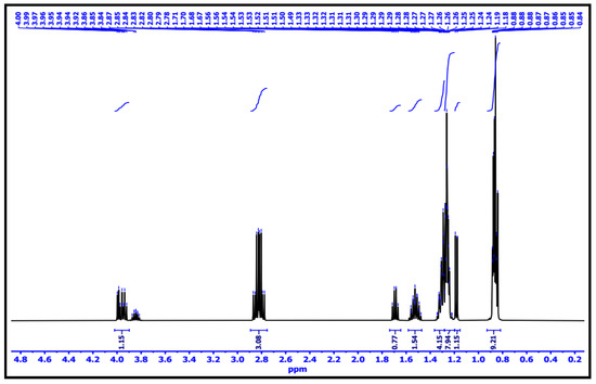 An efficient and crucial tool for predicting the structure of a synthesized ligand is 1H-NMR analysis at 400 MHZ, with DMSO-d6 as a diluent and tetramethyl silane as a reference, performed at 25 °C. The key δ (ppm) mark appears at 0.86, 1.26, 2.84 and 1.53 ppm, which are related to the branched -CH3, -CH2, -N-CH2 and -CH protons of bis-(2-ethylhexyl) amine moiety, respectively. It was found that the methylene protons directly attached to nitrogen atoms (electronegative atom) are more de-shielded than the normal methylene group, resulting in an increase in the value of its chemical shift. The other main δ (ppm) assignments for the Skelton of PVA appear at 1.69, 3.84 and 4.02 ppm, which are related to branched -CH2, -CH and -OH protons, respectively. The characterization of the PPVP composite using 1H-NMR is shown in Figure 4.