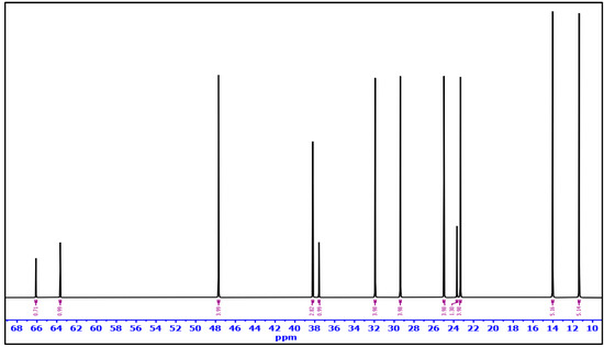 The number of carbon atoms in the synthesized PPVP can be accurately determined by 13C-NMR analysis at 125 MHZ, with DMSO-d6 as the diluent. The skeleton of PVA has the main δ (ppm) that appears at 66.1 ppm as a singlet related to -CH group. The high value of the chemical shift may be due to the attachment of the –OH group. It was found that the methylene group (-CH2) appears at 37.6 ppm. The main δ (ppm) assignments appear at 14, 29.4, 47.7 and 38.2 ppm, which are related to branched -CH3, (-CH2)n, -N-CH2 and -CH carbons of bis-(2-ethylhexyl) amine moiety. It was found that the methylene carbons which are directly attached to nitrogen atoms (electronegative atom) are more de-shielded than the normal methylene carbon, resulting in an increase in the significance of its chemical shift. The specification of the PPVP solvating extractant using 13C-NMR is illustrated in Figure 5.