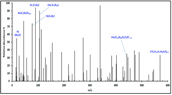 Gas chromatograph-mass spectrometry (GC-MS) was used to determine the purity, base peak (associated with the more stable fragment) and quasi-molecular ion peak (related to the molecular formula). As shown by its molecular ion peak, the molecular weight of the produced ligand is 570 [C34H71N2O2P]n, with a relative abundance of 33%. Some important fragmentation patterns, which are connected to the prepared PPVP, were detected—for example, [C2H4O]n, with m/z =44 (n = 1) and a relative abundance of 77%, [C2H4O]n˙, with m/z = 88 (n = 2) and a relative abundance of 15%, and [C2H3O]n˙, with m/z = 43 (n = 1) and a relative abundance of 7%. These observations indicate the presence of remaining vinyl alcohol building units in the chain of PPVP. Furthermore, other fragments were observed which are considered as signs to the successful formation of PPVP, such as [C2H4]n˙, with m/z = 28 (n = 1) and a relative abundance of 32%, [C2H4]n˙, with m/z = 56 (n = 2) and a relative abundance of 30%, [C32H69O2N2P]˙, with m/z = 545 and a relative abundance of 15%, [C32H68O2N2P]˙, with m/z = 544 and a relative abundance of 12%, and [C32H68ON2P]˙, with m/z = 528 and a relative abundance of 8%. Some alkyl radicals which resulted from the fragmentation of the long chains of bis-(2-ethylhexyl) amine moiety were observed, such as [CH3]˙, with m/z = 15 and a relative abundance of 3%, [CH3CH2]˙, with m/z = 29 and a relative abundance of 4%, and [CH3CH2CH2]˙, with m/z = 43 and a relative abundance of 23%.