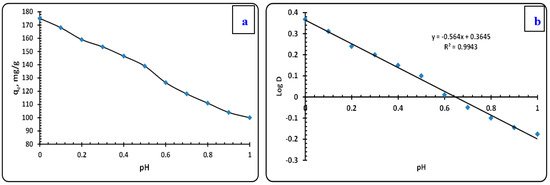 The retention of zirconium ions on PPVP was examined at ambient temperature for 10 min. of shaking using 50 mL of 500 mg/L zirconium ions (0.005 mol/L) solution and 0.1 g of PPVP at a pH that ranged between 0 and 1, because the hydrolysis of Zirconium begins approximately at pH 1.5. Hence, the pH study limit will be in the range between 0 and 1 to avoid the hydrolysis of Zirconium [28]. Figure 7a depicts the acquired data, which reveal the enhancement of the adsorption capacity (qe, mg/g) from pH 1 (qe = 100 mg/g) to pH 0 (qe = 175 mg/g), which remains constant in a highly acidic medium (more –ve pH). The maximum uptake of zirconium ions at pH 0 (qe = 170 mg/g) was observed, since the cationic species were predominant in this range. As the obtained data suggested, pH 0 is the optimum pH for zirconium ions retention on PPVP, with an uptake capacity of qe = 170 mg/g (70%).