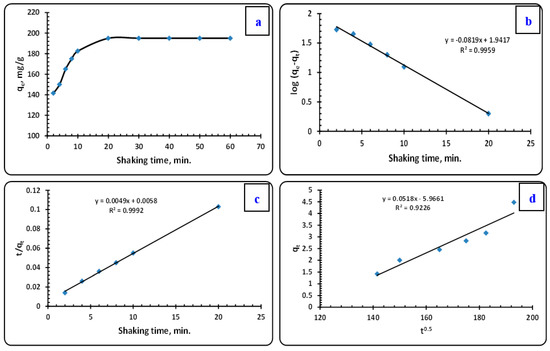 (a) Effect of shaking time on zirconium ions uptake by PPVP. (b) Pseudo-first-order modeling. (c) Pseudo-second-order modeling. (d) Intra-particle diffusion modeling. (Conditions: V: 50 mL, Zr concentration: 500 mg/L, m: 0.1 g, T: 25 °C, pH: 0).