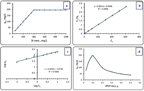 (a) Influence of initial zirconium ions concentration upon zirconium uptake by PPVP. (b) Langmuir isotherm modeling. (c) Freundlich isotherm modeling. (d) Effect of PPVP dose on Zr uptake. (Conditions: V: 50 mL, shaking time: 20 min, m: 0.1 g, T: 25 °C, pH: 0).