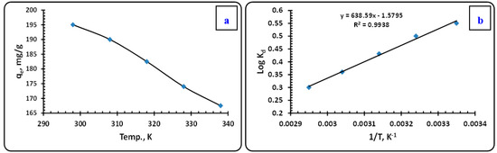 K2 indicates the constant rate (g/mg·min). The slope of the t/qt line is 1/qe,, and the interception is 1/k2qe2. Figure 8c presents that the kinetic modeling for the pseudo-second-order can be employed for the practical data. The mathematically calculated value of qe was 204.08 mg/g, which is nearly similar to the determined realistic uptake of 195 mg/g, with a correlation coefficient R2 = 0.9992 and an extraction rate (K2 = 2.4 × 10−5 g/mg·min). The results demonstrated that the second-order kinetic model is compatible with the experimental results and is therefore appropriate to explain the system being researched. According to the results, the kinetic second-order modeling is more comparable with the test results and is hence suitable for the extraction system interpretation.