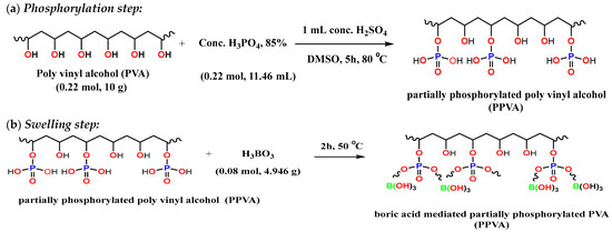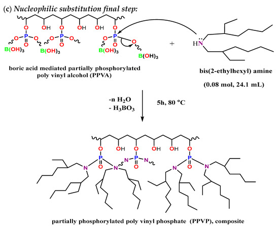 Partially phosphorylated polyvinyl phosphate (PPVP) was synthesized via three main steps. The first phosphorylation step begins by refluxing a mixture of 0.22 mole (≈10 g) from PVA, 0.22 mole of 85% H3PO4 (11.46 mL) and 1 mL conc. H2SO4 in suitable 50 mL of DMSO solvent. The mixture was refluxed at 80 °C for 5 h. The chief purpose of the later step is to introduce phosphoric acid groups into the skeleton of PVA to form the phosphate ester of PVA (partially phosphorylated poly vinyl alcohol, PPVA). After the condensation reaction is turned off, the mixture is allowed to cool at ambient temperature, and then the mixture is slowly poured into absolute ethanol, a white floury pulp precipitate is obtained, which is washed three times with absolute ethanol, and then the precipitate is compiled by vacuum air Buchner. The next swelling step initiates by adding the resulting phosphate ester of PVA to 0.08 mole (4.946 g) of H3BO3 and boric acid [88], which acts as a mediated Lewis acid, in a condenser for 2 h at 50 °C. Lastly, the latter mixture was added to 0.08 mole (24.1 mL) of bis-(2-ethylhexyl) amine, and the mixture was refluxed for 5 h at 80 °C.