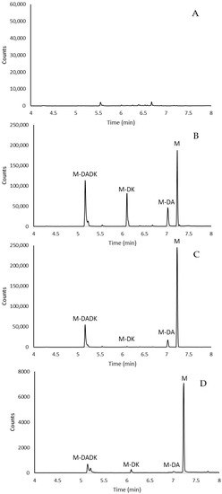 None of the target compounds were detected in plants grown in control soil (Figure 2A) whereas plants cultivated in treated soil presented mean values of 6.9 mg/kg dry weight of metribuzin, 1.6 mg/kg dry weight of M-DA, 0.1 mg/kg dry weight of M-DK, and 1.9 mg/kg dry weight of M-DADK. Figure 2 shows the chromatograms of a plant extract and a soil extract of a sample collected 23 days after the application of metribuzin to the soil. The higher presence of metribuzin and M-DADK found in plants after 23 d was in accordance with the results reported by EFSA [16] in the residue trials conducted in soybean after spraying with metribuzin.