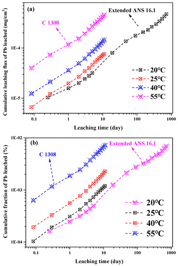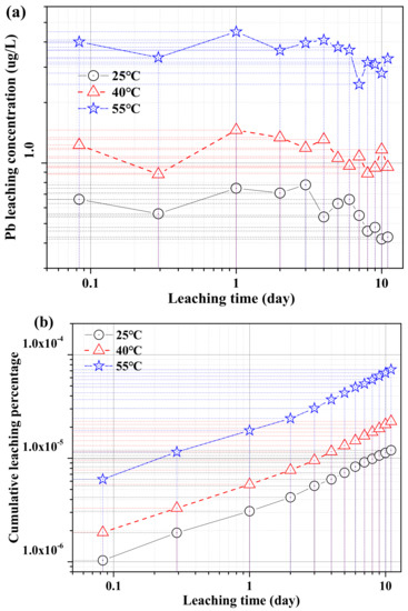 (1) The leaching of lead from the S/S monolith could be accelerated by an increase in temperature in the range of 25–55 °C. Higher temperatures could improve the leaching rate and the concentration of lead. The leaching concentration of lead in the leachate at 55 °C was about one order of magnitude higher than that of the leachate at 25 °C, and the cumulative leaching amount of lead the test conducted for 11 days at 55 °C was 5.81 times that at 25 °C.