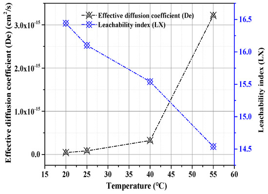 As presented in Figure 3, the effective diffusion coefficients of the S/S monolith at 25 °C, 40 °C, and 55 °C were 8.38 × 10−17, 3.23 × 10−16, and 3.22× 10−15 cm2/s, respectively. The results showed that the leaching and release rate of lead ions in the S/S monolith increased significantly with an increase in the ambient temperature. The increase in the leaching index and the decrease in the effective diffusion coefficient indicated that the mobility of lead ions in the S/S monolith was enhanced. The movement and leaching rate of lead from the S/S monolith increased with the increase in ambient temperature. The equilibrium concentration during the leaching process increased, thus intensifying the accelerated leaching process of heavy metals from the S/S monolith [9,30]. As the temperature increased from 25 °C to 55 °C, the effective diffusion coefficient increased by about 40 times.