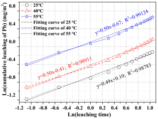 The leaching mechanism of lead in the long-term semi-dynamic S/S monolith kept for 2 years under distilled water was controlled by diffusion [18]. The fitting results of the logarithmic curve of cumulative leaching amount and leaching time at different temperatures are shown in Figure 4. It can be seen from Figure 4 that the fitting results of the cumulative leaching amount and leaching time for lead ions in the S/S monolith at 25, 40, and 55 °C presented slopes of 0.49, 0.50, and 0.50, and the square of the correlation coefficient was 0.98783, 0.98911, and 0.99124 for the tests conducted at 25, 40, and 55 °C, respectively. According to the slope of the fitting curve, the leaching mechanism of lead ions was strictly controlled by diffusion in the temperature range of 25–55 °C. The leaching and release process of lead ions in the S/S monolith accelerated with the increase in temperature, but the leaching mechanism remained the same, which met the requirements of the acceleration test.