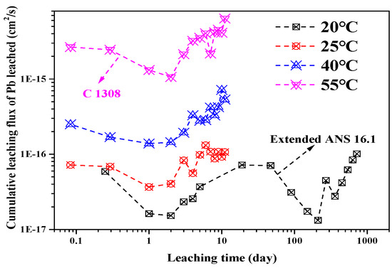 The leaching flux refers to the release rate of heavy-metal ions from the surface of the S/S monolith during the leaching test. The comparison of the test results for short-term accelerated leaching and long-term leaching is shown in Figure 2. It can be seen from the figure that at 25 °C, 40 °C, and 55 °C, the 11-day leaching fluxes of lead ions in the cured body were 7.62 × 10−5, 1.45 × 10−4, and 4.58 × 10−4 mg/cm2, respectively. The cumulative leaching flux of lead ions in the S/S monolith kept at 20℃ for two years was 4.75 × 10−4 mg/cm2. The cumulative leaching fractions (calculated according to the total lead content of the S/S monolith) for the 11-day experiments at 25 °C, 40 °C, and 55 °C were 1.19 × 10−5, 2.27 × 10−5, and 7.18 ×10−5 mg/cm2, respectively. The leaching fraction of lead ions in the S/S monolith kept at 20 °C for two years was 6.94 ×10−5 mg/cm2. The cumulative leaching amount at 55 °C for 11 days was 5.81 times that at 25 °C, and the cumulative leaching amount at 20 °C for 720 days was 7.01 times that at 25 °C. Although the duration of the long-term leaching experiment was about 65 times that of the short-term test, the leaching behavior of the tests conducted at different temperatures was similar to that of the long-term tests.