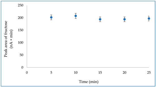 The stability study of psicose and its precursor (fructose) aimed to ensure that the proposed UAE, as a sample preparation step in the determination method, did not significantly alter the analyte initially presented in the sample. It must be noted that ultrasounds provide energy to the system, mainly at the interface between the liquid solvent and the solid sample. Therefore, the solvent and sample were heated to promote the epimerization reactions. The UAE process was evaluated in the range of 5 to 25 min at 50 °C, to ensure that epimerization of fructose into psicose did not occur during the extraction (Figure 2). ANOVA suggested that fructose values were not significantly different at any time (Table 1). Therefore, fructose was fully stable in the extraction conditions for up to 25 min. However, 10 min was chosen for further experiments. A 10 min extraction time of psicose was also used in various food matrices, using UAE at 20 °C [4]. These results agreed with the previous work on fructose stability behavior regarding heating temperature and time, which explained that significant fructose degradation was observed in the heating process at a range of 110–150 °C temperature for 1 to 5 h [16].