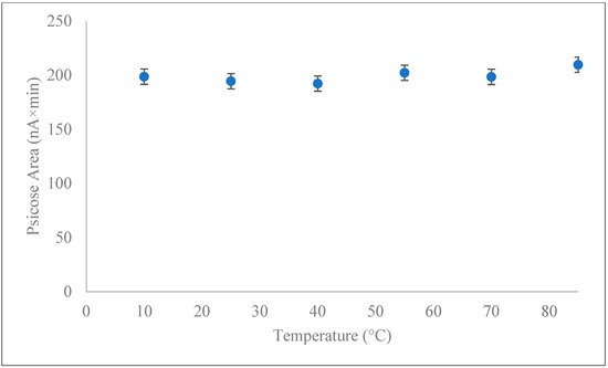 A similar study was performed to determine the stability of psicose during regular UAE conditions. In this case, different extraction temperatures were evaluated (10 to 85 °C) in a constant extraction time (10 min). These experiments were carried out by spiking the standard of psicose on raisins to guarantee that any effect related to the interaction between psicose and the raisin matrix could be observed. Moreover, these psicose levels were not increased due to the degradation of fructose in the samples. The results are shown in Figure 3. There were no significant differences (p < 0.05) in the extraction results due to different extraction temperatures (Table 2). These results concluded that extractions of psicose could be performed at any temperature between 10 and 85 °C without worrying about significant changes in psicose content affected by the extraction process. A specific 25 °C extraction temperature was chosen for the subsequent studies, because it provided a very low standard deviation and allowed a very fast stabilization of the extraction media. The other reported method to determine psicose also works at room temperature for the extraction procedure [4]. Some degradation reactions have also been reported, precisely the Maillard reaction for psicose extraction, which was run at temperatures around 100 °C and higher [17].