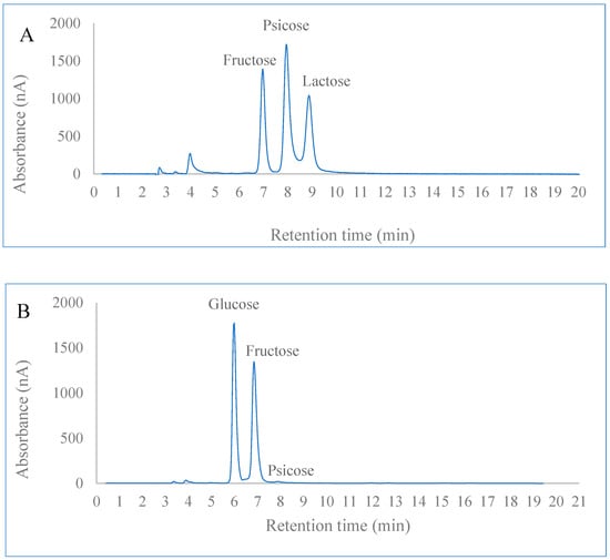 The representative chromatograms of a mixture of standard compounds (fructose–psicose–lactose) (A) and extract from raisins spiked with psicose standard (B).
