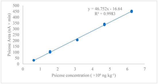Five levels of psicose concentration (1.0, 2.5, 5.0, 7.5, and 10 mg L−1 ) in triplicate were used to assess the linearity over the concentration range. Figure 5 shows the calibration curve for psicose that resulted in a coefficient of regression (R2) of 0.9982. The limit of detection (LOD) and limit of quantification (LOQ) were determined using three and ten times, respectively, the slope, divided by the standard deviation at the origin of the calibration curve. The resulting values for LOD and LOQ were 208.6 ng kg−1 and 695 ng kg−1, respectively.