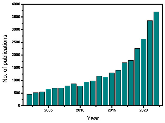 The frequency of the studies that have been published in the field of heterogeneous catalytic ozonation over the last 20 years (2002–2022) with the use of different solid catalysts is shown in Figure 1. Note that most of these studies are based on batch experiments. The relevant literature was collected from Science Direct, Scopus, MDPI, and PubMed databases using relevant keywords, such as heterogeneous catalytic ozonation, advanced oxidation processes, catalysts, micropollutants, etc. From Figure 1, it becomes clear that heterogeneous catalytic ozonation is a relatively recent investigated process, which began to be studied systematically during the last ten years. Of the approximately 30,000 studies, concerning this process, 24,000 were published from 2010 onwards. Most of these studies are related to the production of an efficient catalyst or to the modification of commercial materials, usually by depositing proper metals into their structure, whereas a lower number of studies refer to the investigation of the reaction mechanism(s).