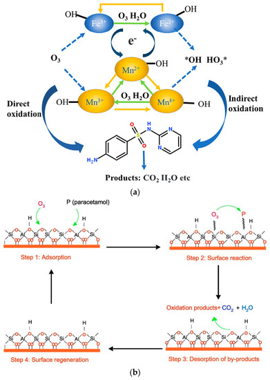 Examples of (a) radical [8] and (b) non-radical mechanism [10] for the removal of micropollutants during heterogeneous catalytic ozonation.