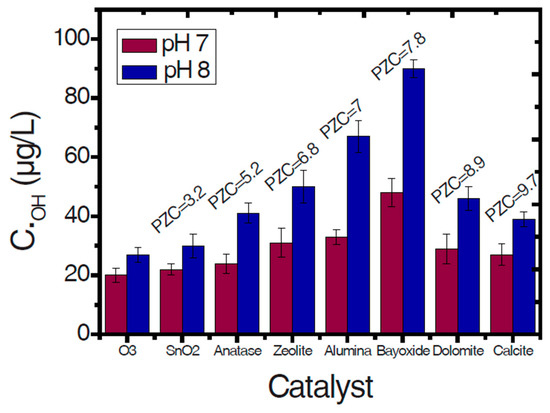Alumina is the most frequently used metal oxide as a common substrate for the deposition of several metals, such as Cu, Mn, Fe, Ni, and Ti, to improve the catalytic activity of ozonation systems. Moreover, it can act as a catalyst without any preliminary modification procedure. Peng et al. [57] and Bing et al. [58] deposited onto its structure Ni and Ti, respectively, taking advantage of the larger surface area of this material in comparison with considering also the respective Lewis active sites. At pH 7 these hybrid materials showed the greater catalytic activity, both in terms of pollutants removal and of system mineralization. Although by increasing the pH value, more hydroxyl radicals will be produced, the important role of PZC value in the heterogeneous catalytic ozonation process was also observed during these studies. The ozonation systems present a limit at which the oxidation efficiency is the highest. The PZC values of Ni/Al2O3 and of γ-Ti/Al2O3 composite materials were near 8 and 7.3, respectively. In the first case, the adsorption did not particularly influence the catalytic activity and the optimum pH value was 8, at which the hydroxyl groups of the solid surface were neutrally charged. This charge promoted to a great extent the decomposition of ozone towards the production of hydroxyl radicals when compared to the respective protonated forms.