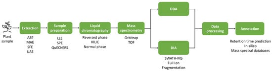 Despite that, real new knowledge is generated by finding unexpected compounds in a sample, which are described as “unknown knowns” and “unknown unknowns” [5]. To find those unknowns, non-target screening represents the method of choice. For this purpose, three major techniques are used to acquire spectra of samples after sample preparation: one of these techniques is nuclear magnetic resonance (NMR) [6,7], the other two techniques represent liquid chromatography coupled to a high-resolution mass spectrometer (LC-HRMS), and gas chromatography coupled to a mass spectrometer (GC-MS) [8]. The latter was used for a long period of time as gold standard to detect volatile compounds, due to its instrument standardization and, therefore, its comparability of data acquired by different laboratories [9]. A major disadvantage of GC-MS is that polar and thermally labile compounds must be derivatized in order to analyze them [9]. In contrast, LC-HRMS/MS can be used for those compounds with minor sample preparation. In particular, the ability to obtain fragment spectra by collision-induced dissociation, after the ionization process in LC-HRMS [10], which represents a fingerprint of the compound’s structure, facilitates the identification. After the acquisition of spectra, data processing has to be conducted to separate compound spectra from each other, using retention times and precursor masses. To be able to conduct non-target screening, spectral databases in combination with search algorithms are needed to compare the acquired fragment spectra with spectra of reference standards for the identification of compounds. However, the occurrence of these reference spectra is a bottleneck. For a total amount of 129 million registered compounds [11], the biggest database for non-volatile compounds includes just more than 40,000 spectra of more than 15,000 compounds [12]. This exemplifies that only a fraction of compounds in samples can be found by comparing LC-HRMS/MS fragment spectra with databases, and more effort must be taken to expand the number of compounds in these libraries. This technique of identification was widely used for the identification of water pollutants [13,14,15,16,17] and drugs [9,18,19,20,21,22,23,24]. Jorge et al. published a review describing several targeted applications of LC-MS for metabolite screening [25]. However, non-target screening is a promising technique to conduct an exhaustive metabolite profiling for various applications, such as determining contaminants, biomarkers and the location of cultivation, which will be described in this review. Furthermore, it will outline the different steps of non-target screening, i.e., extraction of the sample, sample preparation, data acquisition, data processing and compound annotation.