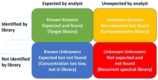 “Rumsfeld Quadrants” showing the intersection of yes/no answers for whether analysts expect a compound to be identified in the sample (prior probability) and whether it was identified in a library search [5]. Adapted with permission from [5].
