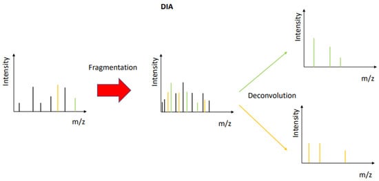 In contrast, data-independent acquisition (DIA) methods fragment all ions of the sample (Figure 4). The simplest mode is the all-ion fragmentation technique, which fragments every ion that is ionized. The sequential windowed acquisition of all theoretical fragment ion mass spectra (SWATH-MS) represents another DIA method, and was described by Gillet et al. (Figure 5) [50]. In SWATH-MS, all ions in a certain mass window are fragmented. The mass window described by Gillet et al. was set to an m/z of 25 Da plus a mass overlap of 1 Da for each window [50]. The authors compared the method for the analysis of yeast proteins with single reaction monitoring (SRM). It was concluded that targeted identification of the proteins is comparable with SRM analysis [50]. The biggest disadvantage of SWATH is the deconvolution process which is needed to separate the fragmentation spectra of the different ions from each other [36]. This can be achieved by employing software tools such as MS-DIAL of Tsugawa et al. [51]. Another disadvantage is that just a limited number of mass windows per chromatographic peak can be acquired, because of the amount of time needed for the collection of an MS1 spectrum (up to 100 ms) and the corresponding collection of a SWATH spectrum (10 ms per window). Therefore, only a maximum of 40 windows can be acquired per chromatographic peak [51], which limits either the mass range, or the range of a mass window. In addition, is still a limited number of instruments capable of performing SWATH acquisition [52].