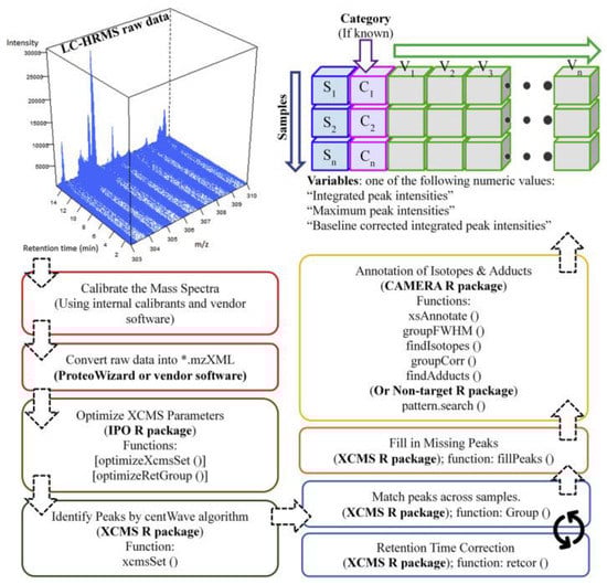 After obtaining recorded mass spectra with the previously described techniques, raw data has to be processed with appropriate tools to be able to annotate analytes with non-target screening [44]. Katajamaa et al. described the theoretical basics of data processing in detail in their review [57]. Briefly, the steps of data processing are filtering, feature detection, alignment and normalization [57]. The filtering step includes noise reduction by applying smoothing functions, such as the Savitzky–Golay filter. In addition, baseline removal can be applied to remove the shift of the baseline caused by chemical noise [57]. Feature detection is the next step in data processing. There are three different approaches for feature detection. The first approach is vectorized peak detection, where peaks are independently found in the mass and retention time direction [57]. The next approach is extracting data to produce an extracted ion chromatogram (XIC) with a narrow mass window. These XICs are independently searched in the time domain for peaks, which represent features [57,58]. The last approach for feature detection is fitting a model against the raw data. Here, isotopic patterns are included to find features, which could improve the feature detection [57]. Alignment is needed for the correction of retention times between different runs of a sample or between recordings of different samples. Alignment algorithms use either all recorded raw data or cluster features in a matrix, where the rows represent features and the columns represent different additional information, such as peak area [57]. The aim of normalization is to remove bias in ion intensities caused by systematic differences between measurements of the samples. Two major approaches are applied for normalization: the first is the statistical approach, which aims to find a statistical model for scaling of intensities. The second approach is empirical, by normalizing the measurements with signals recorded from internal or external standards [57].