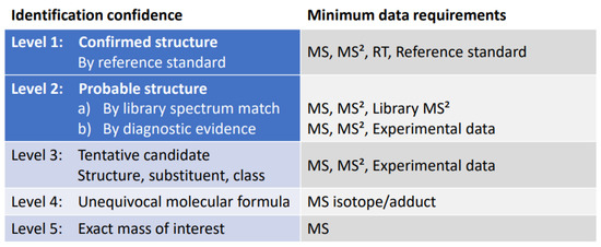 Schymanski et al. proposed five levels for communicating annotation confidence (Figure 7) [77]. Level 1 represents a confirmed structure, which was confirmed with reference standards by recording its MS, MS/MS spectra and retention time. For non-target screening of metabolites in complex samples, level 2, at least, should be the goal in terms of its annotation confidence, which represents a probable structure. This level is divided into two sublevels. Level 2a needs an unambiguous match in a spectral library and a match of retention time or retention time index, which is often used in gas chromatography [77]. Level 2b needs confirmation with experimental data. This level can be obtained if no spectral data is available in the literature or spectral library, but the acquired experimental data excludes any other structure. Tentative structures represent a confidence of level 3. This level is similar to level 2b, but the exact structure cannot distinguish which possible isomer is the right one. Another example of level 3 identification would be high ranked matches of in silico fragmentation. Unequivocal molecular formula represents confidence level 4 [77]. This is the case where a molecular formula can be determined using an MS spectrum, but, for example, there are too many impurities in the spectrum to be able to use the spectrum for a more detailed annotation. A level 5 confidence is reached by comparing the accurate mass with the measured data [77].
