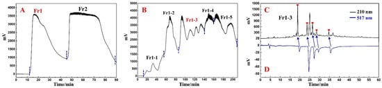 Chicago/Turabian StyleLv, Yue, Ze Wang, Qilan Wang, and Jun Dang. 2022. "Medium- and High-Pressure Integrated Chromatographic Strategies for the Isolation and Purification of Free Radical Inhibitors from Dracocephalum heterophyllum" Separations 9, no. 12: 420. https://doi.org/10.3390/separations9120420
