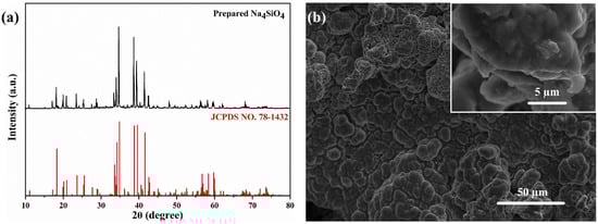 (a) XRD patterns and (b) SEM images of the Na4SiO4 synthesized at 600 °C.
