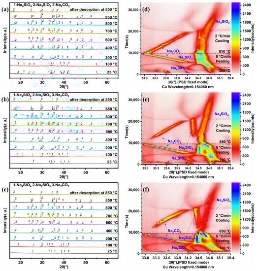 Decarbonization: When the temperature rose to 850 °C, the gas flow was changed to 100% N2. In Figure 2d, Na2CO3 and Na2SiO3 phases were always present from 850 to 50 °C, and the weak intensity of Na4SiO4 was detected. The desorption did not proceed completely because the time spent in desorption was not long enough, and the temperature decreased gradually. In Figure 2e,f, the intensities of the Na2SiO3 phases weakened rapidly, and the Na4SiO4 phase appeared with higher intensity than that of the P–Na. When the temperature dropped from 850 to 765 °C, the Na2CO3 phases could be found in Figure 2e,f. This was because the product Na2CO3 and the mixed carbonates formed a melt at higher temperatures. As the temperature continued to decrease, the Na2SiO3 phase was observed. This indicates that the promotion of doped carbonates in desorption was less pronounced than in adsorption.