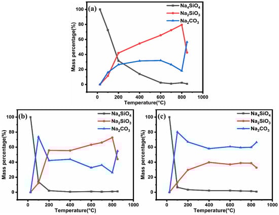 Carbonization: In Figure 2d, the Na2SiO3 phase appeared at 300 °C. After which, the Na4SiO4 phase disappeared quickly with the increasing temperature. From 300 °C to 850 °C, the Na2SiO3 phase appeared in abundance with Na2CO3. As the temperature increased, the intensities of Na2CO3 and Na2SiO3 increased slowly. In Figure 2e,f, due to the addition of carbonates, the phase of Na4SiO4 vanished gradually at 100 °C. Hence, it was confirmed that the alkali carbonates allowed the CO2 capture of Na4SiO4 to occur at lower temperatures. Under the same experimental conditions, for samples 10(LiNa)90Na and 10(LiNaK)90Na, the intensities of the Na2CO3 and Na2SiO3 phases slightly strengthened with increasing temperature compared with those of P–Na. This suggests the promotion of doped carbonates to Na4SiO4 in CO2 capture.
